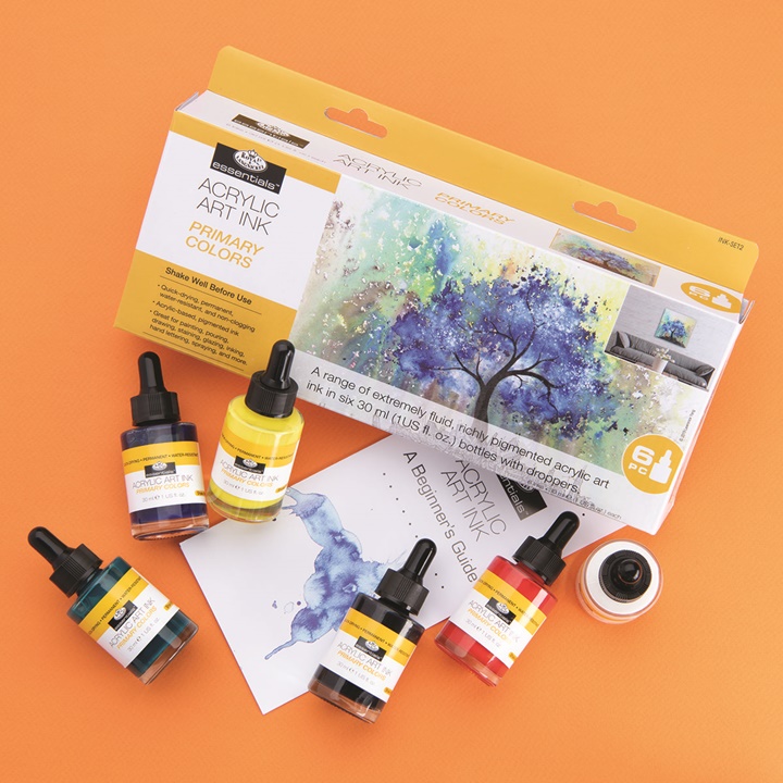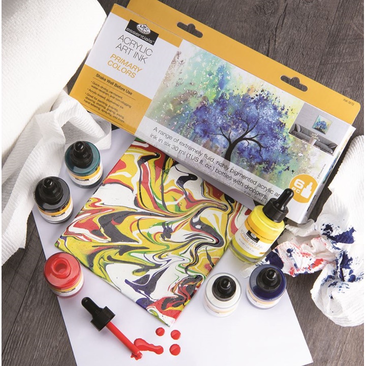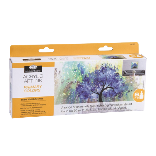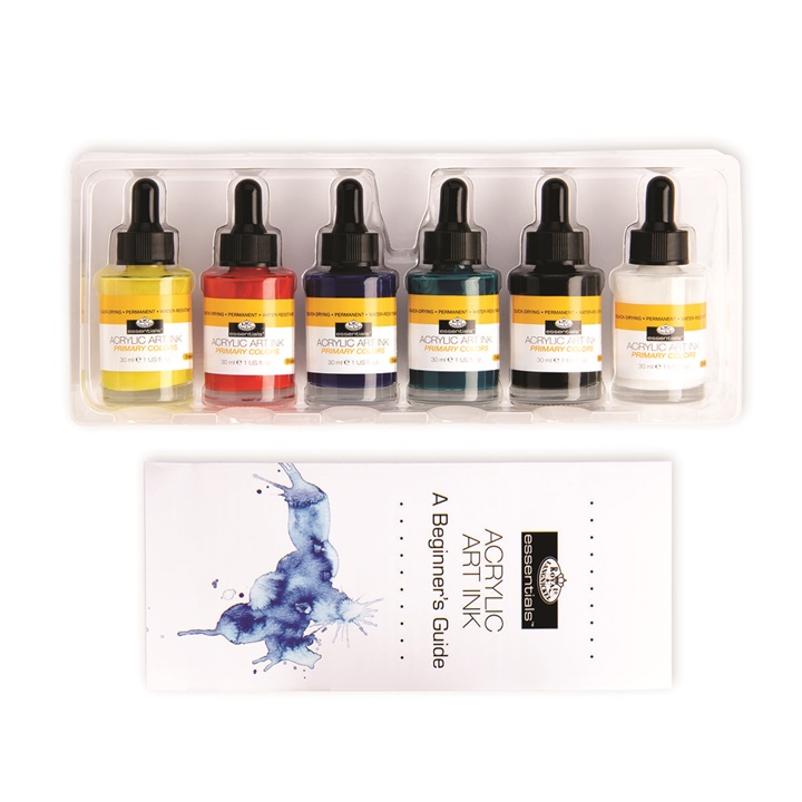 Sada akrylových atramentov Royal & Langnickel Primary pozostáva zo šiestich 30ml sklenených fľaštičiek inkov v zkladných farbách. Atrament je krásne tekutý a vysokopigmentovaný. Rýchlo schne a po uschnutí je vodeodolný a permanentný. Akrylový ink je možné použiť na rôzne povrchy - papier, plátno, lepenka, drevo,... Aplikuje sa štetcom, hubkou alebo pipetou, ktorá je súčasťou každej fľaštičky. Dá sa použiť tiež na techniku airbrush, pouring alebo kaligrafiu.