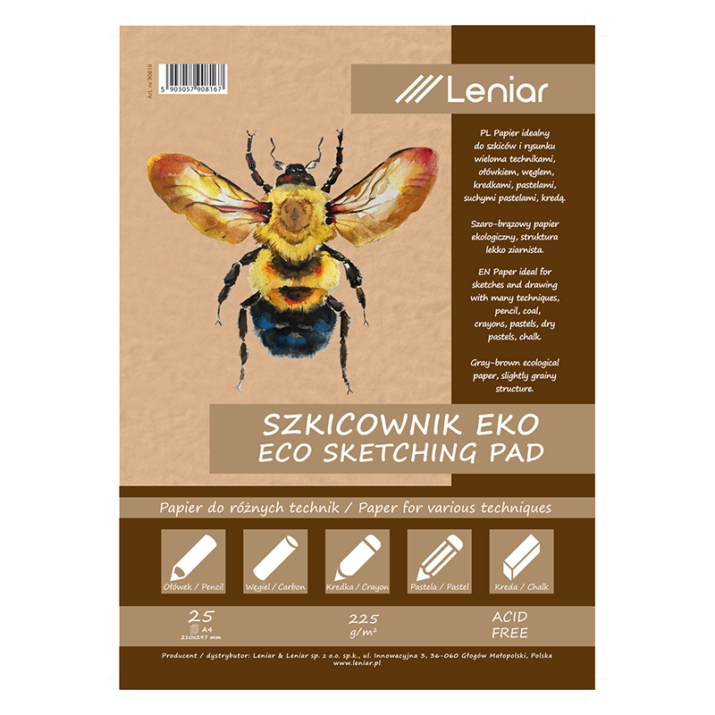 Leniar skicár Včela (Bee) obsahuje papier ideálny na skicovanie a kreslenie mnohými technikami, ceruzka, uhlík, pastelky, pastely, suché pastely, kriedy..