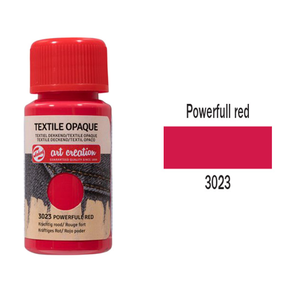 Farba Talens ArtCreation Opaque je nepriehľadná textilná farba na tmavé textílie. K dispozícii je 10 farieb. Textil vopred umyte bez zmäkčovača. Ozdobte textíliu špongiou alebo mäkkým štetcom a po 30 minútach sušenia ju zafixujte žehlením (na bavlnu) medzi hárkom a žehliacou doskou listom papiera odolného voči mastnote. Po zafixovaní sa textílie môžu prať pri teplote do 40 °C a sú vhodné aj do sušičky.