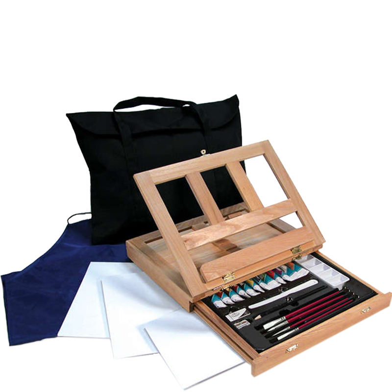 Súprava pre umelcov so stolovým stojanom. Tento stojan je ideálny pre každého začínajúceho nadšeného alebo profesionálneho umelca a je vyrobený z kvalitného jaseňového dreva s holubičími spojmi. Zariadenie je vybavené úložnou zásuvkou, ktorú možno zatvoriť bez toho, aby ste museli stojan rozložiť. Na stojan sa zmestí akákoľvek tabuľa štandardnej veľkosti a je vybavený štyrmi nastaviteľnými uhlami na zabezpečenie pohodlia.