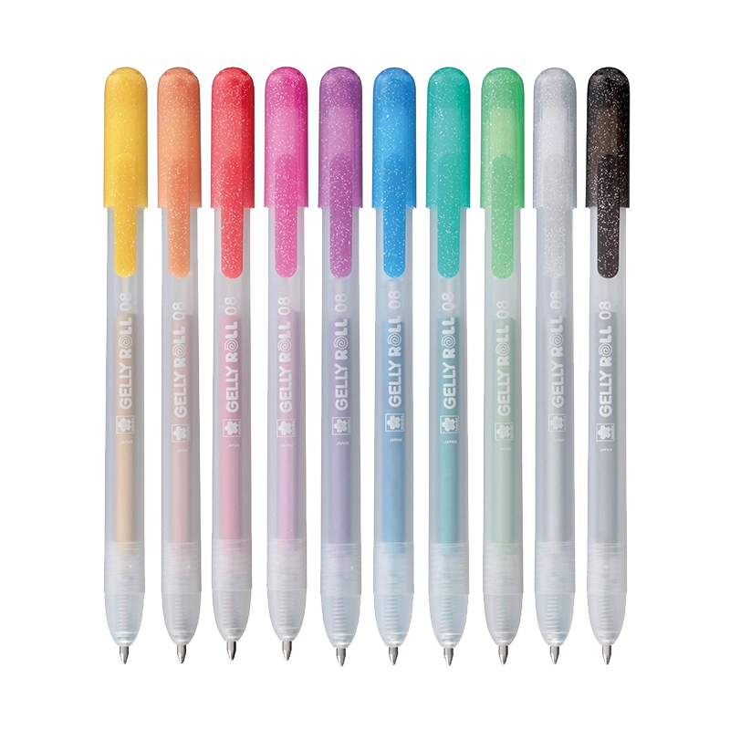 Táto sada obsahuje 10 výsuvných gélových pier s metalickým atramentom – červeným, ružovým, fialovým, modrým, zeleným, smaragdovým, zlatým, strieborným, medeným a čiernym.